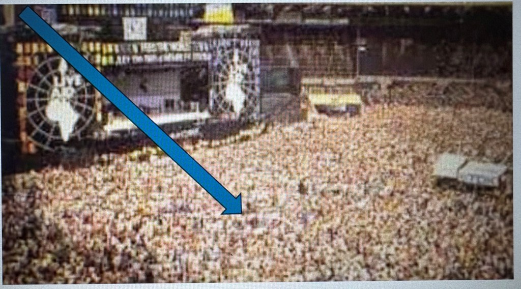 We joined a queue at a gate at the back of the stadium – i.e the end directly opposite to the stage. We were right at the front of the queue, right up next to the turnstile and it’s only when I look at an aerial photo of the crowd, do I realise the significance. The gates opened, a quick loo visit and on to the pitch – and on and on. We settled at what felt like a long distance from the stage – but actually – it wasn’t. Look at one of those crowd shots from the air. There was a mixing desk central to the stage – and we were a little in front of that, to the left as one looked at the stage – about a third of the way to the edge. And we waited. God knows how – but I didn’t move from that spot for another 12 hours.